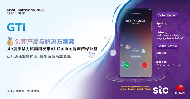 在MWC26 巴塞罗那期间,全球领先运营商stc和华为凭借在新通话产业做出的领先创新和卓越示范,共同荣获了GTI Awards 2026“创新产品与解决方案奖”。