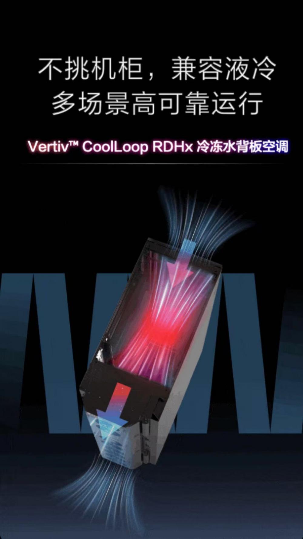 “伴随 AI 服务器向液冷技术的加速演进,如何高效处理空气侧的‘残余热负荷’成为关键挑战。Vertiv™ CoolLoop RDHx 冷冻水背板空调采用紧凑的零占地设计,与液冷系统实现无缝‘风液协同’,为高密度算力环境提供高效、极简且具备卓越扩展性的热管理方案。”
