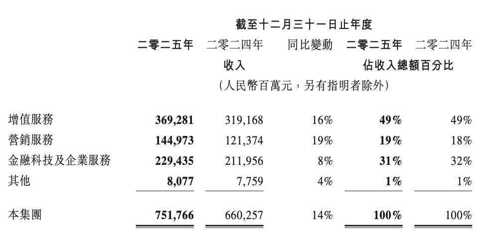 三大核心业务毛利均实现双增,增值服务(+22%)、营销服务(+24%)、金融科技及企业服务(+17%)成为利润增长基石;
