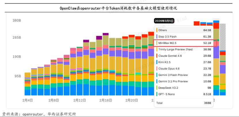 根据OpenRouter数据,龙虾(OpenClaw)大热之后,MiniMax的Token消耗量位居前列,且2月周度增长超过20%,以此类推,2-3月MiniMax大概同比增加了2倍上下的Token消耗量,大致先前与股价上涨幅度大致相当。