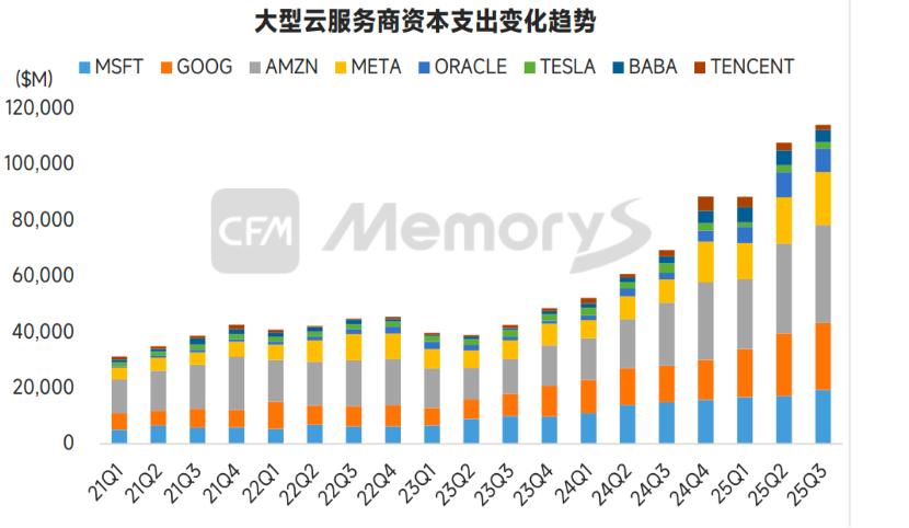 随着AI需求快速扩张,全球互联网巨头正扩大采购,加速扩建数据中心等基础建设,2025 年谷歌、亚马逊、Meta、微软、甲骨文和腾讯、阿里巴巴 、特斯拉的云服务提供商合计资本支出合计约4000亿美元,预计2026年资本支出将增长25%至约5000亿美元。