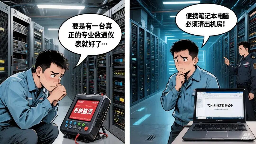 稳定性焦虑:非专业数通仪表产品面临产品不稳定因素,专业数通仪表配合消费级笔记本7×24小时满负载运行,过热、蓝屏、死机随时可能导致测试归零。