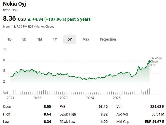诺基亚近五年股价缓慢上涨,去年布局AI等新兴领域后,增速加快(数据&图源:LSEG)