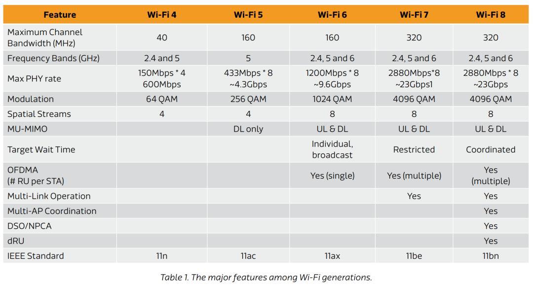 摘自联发科白皮书《 Pioneering the Future with Wi-Fi 8 》,各代 Wi-Fi 技术区别
