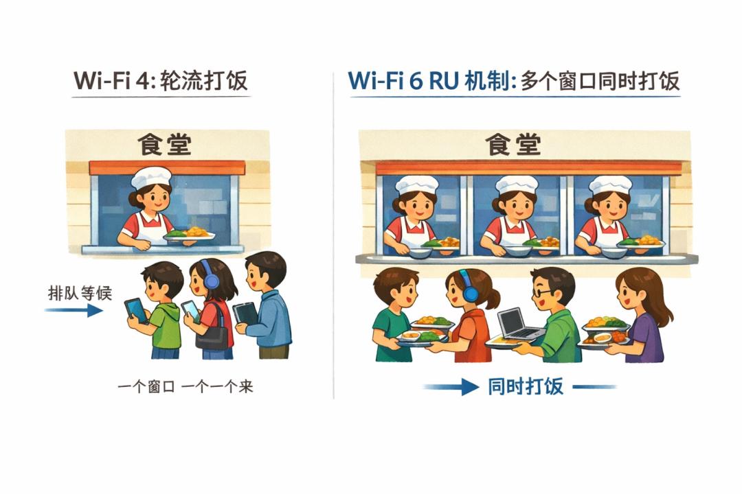 后来 Wi-Fi 7 这套系统再一次升级为 “ MRU ”,允许同一个设备一次拿到多个 RU 资源块,而且这些资源块既可以是连续的,也可以是分散的。就好比大家打饭的时候,旁边窗口有空位也可以灵活利用,甚至影分身,同时在不同窗口打饭。