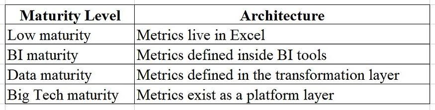 商业智能供应商将其作为一种便捷的指标模型进行销售。现代数据架构称之为指标层。人工智能团队则声称,如果没有它,就无法构建分析代理。但如果你仔细观察一下主要科技公司(Uber、Netflix、Airbnb、LinkedIn、Spotify)的架构,就会发现它们的含义与“语义层”一词通常所暗示的含义截然不同。