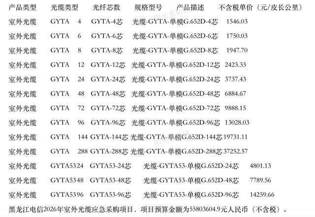C114讯 3月23日消息(南山)近日,中国电信集团黑龙江电信分公司发布2026年室外光缆应急采购项目招标公告。