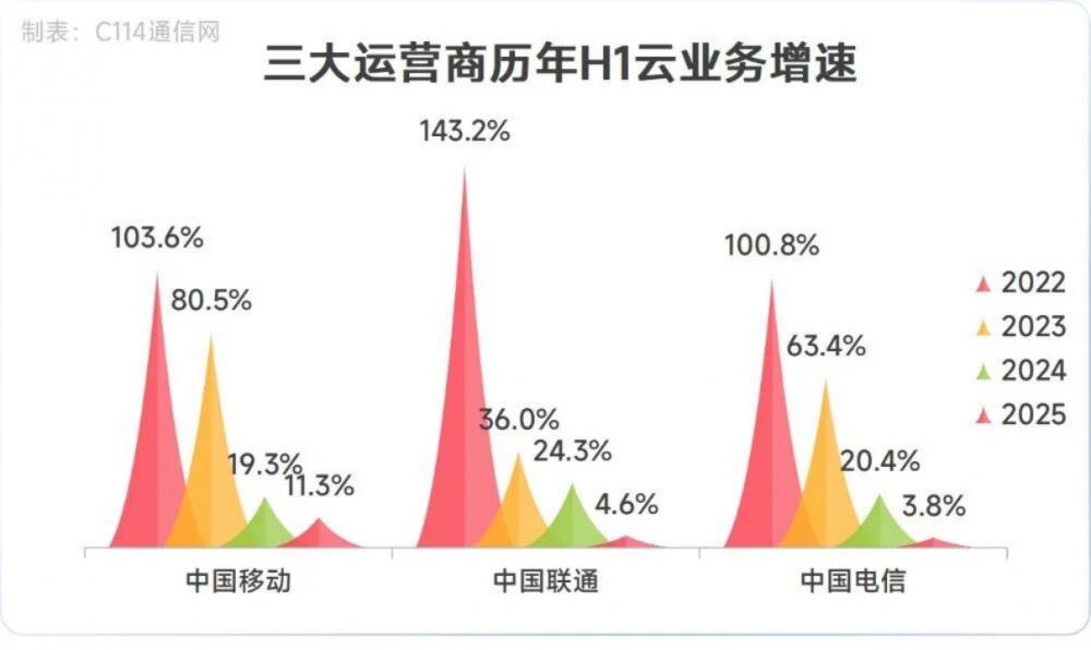 从近两年的业绩数据来看,三大运营商云的增速均呈现明显放缓趋势,尤其是2025年上半年,增速进一步下滑。2025年上半年,移动云收入同比增11.3%,联通云增4.6%,天翼云仅增3.8%,均远低于此前的高增速。