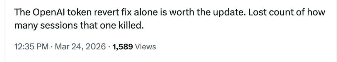 而在OpenAI这边,OpenAI Token的回退到过期值的Bug也被修复了。