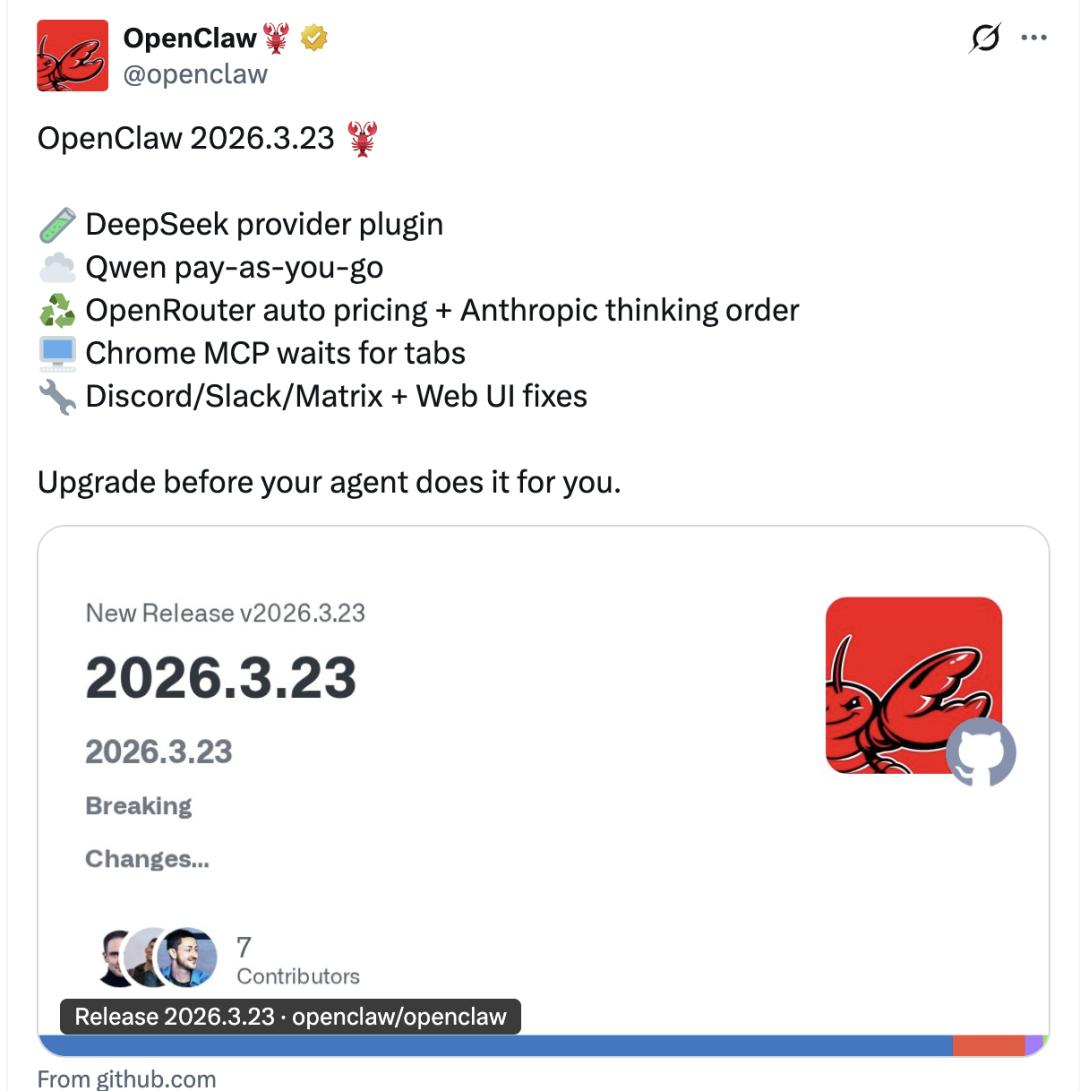 刚刚,龙虾火速更新到OpenClaw 2026.3.23版本。