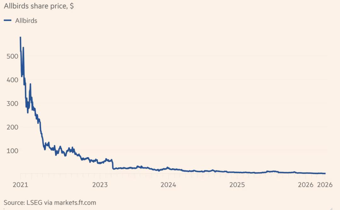 2022 年至 2025 年间,Allbirds 的销售额断崖式下跌了近 50%,从 2.98 亿美元萎缩至 1.52 亿美元,其始终未能实现盈利,股价也从巅峰期的近 30 美元一路跌入几美分的深渊。