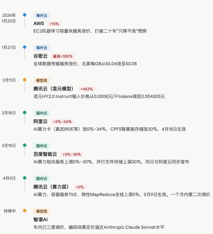 明天(4月18日),阿里云、百度智能云将正式开始调价。3周之后,腾讯云也将迎来新一轮涨价。全球范围内,OpenAI、Anthropic在过去18个月里把API价格降了超过80%,DeepSeek-R1的出现更让外界相信推理成本即将归零。