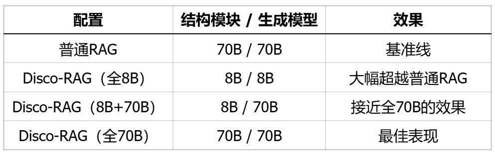 Disco-RAG的三个模块(论证树、关系网、提纲)和最终的答案生成是解耦的,可以用不同大小的模型来分别承担。团队做了一组混合部署实验:用参数量较小的Llama-3.1-8B负责所有结构分析模块,只在最后的生成环节调用Llama-3.3-70B。
