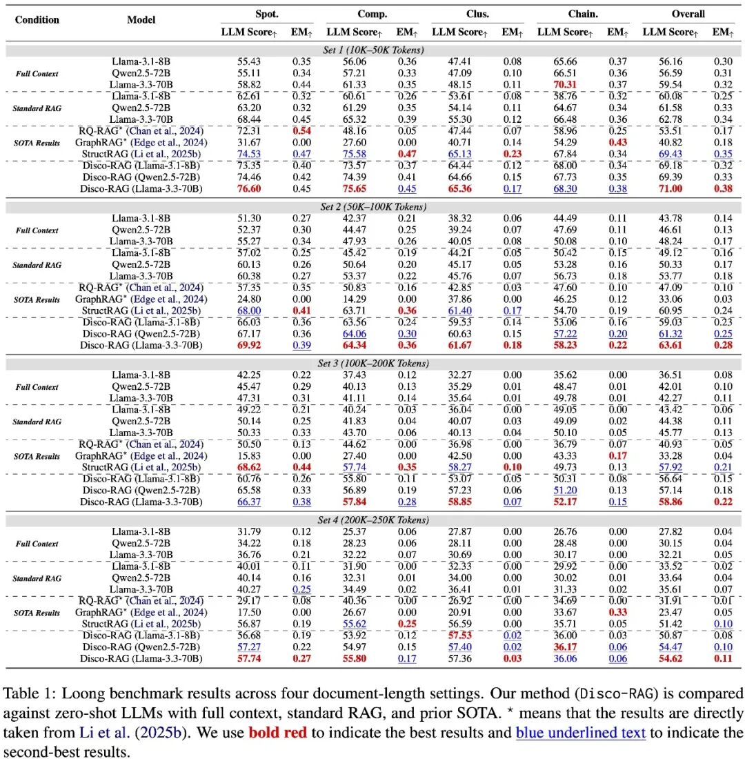 这个基准测试模型在超长文档上的推理能力,文档长度从1万到25万tokens不等。核心发现:文档越长,Disco-RAG的优势越大。在最长的25万tokens档位,普通RAG几乎完全失效,而Disco-RAG依然能给出有效回答。更值得一提的是,Disco-RAG的整体表现甚至超过了需要专门训练的方法。