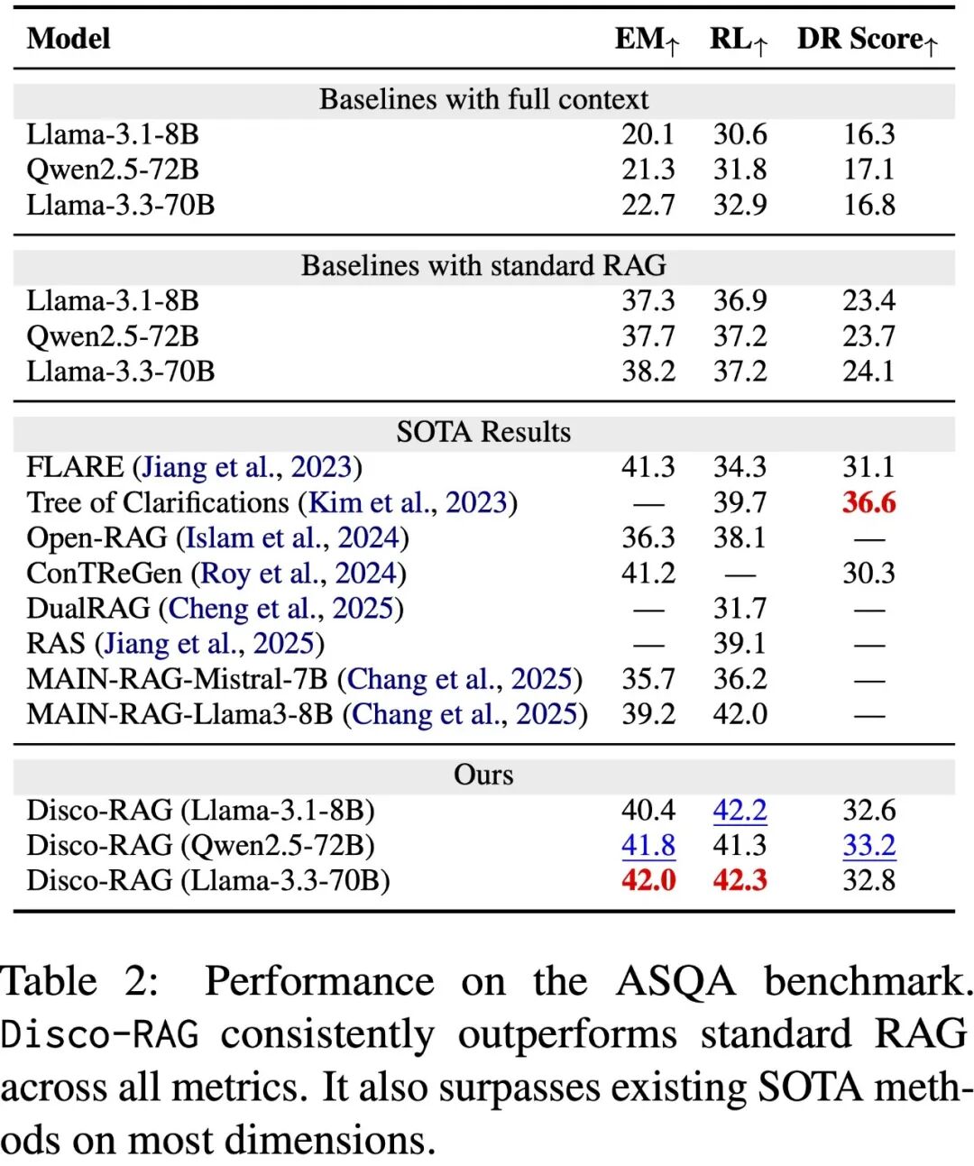 面对含义模糊的问题,Disco-RAG在核心指标上均刷新了最佳记录。更值得注意的是,即使只用参数量很小的模型,Disco-RAG也能达到此前各种专门设计的系统的水平。