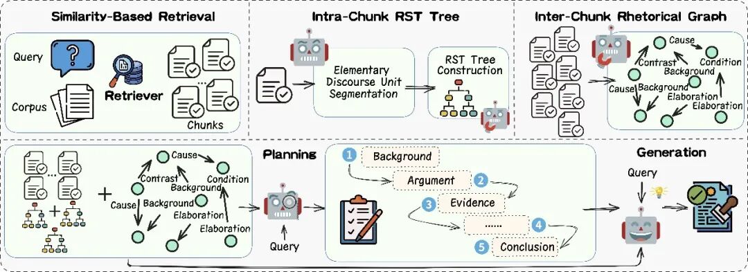 思路很直接:在“搜”和“答”之间插入一个“读懂”环节,用语言学里经典的修辞结构理论(RST)解析文本逻辑,再让模型动笔。