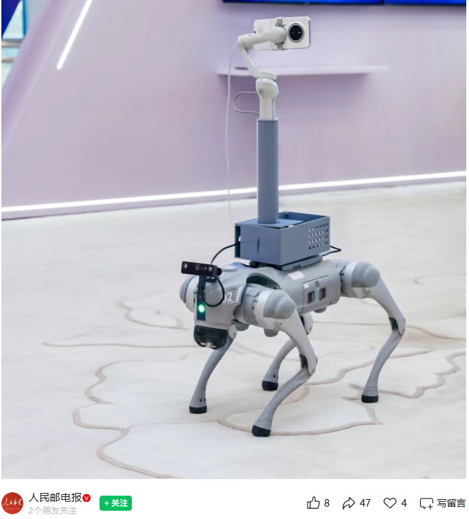 现场实测显示,5G-A 超级上行网络峰值瞬间达到了 1Gbps 以上。一个四足机器人借助 5G-A 超级上行广覆盖能力,可以根据地形实时调整步态,实现智能取件、即时送达,也可化身“智能跟拍摄影师”,跟随并捕捉动态行人并高频上传图像到云端处理。