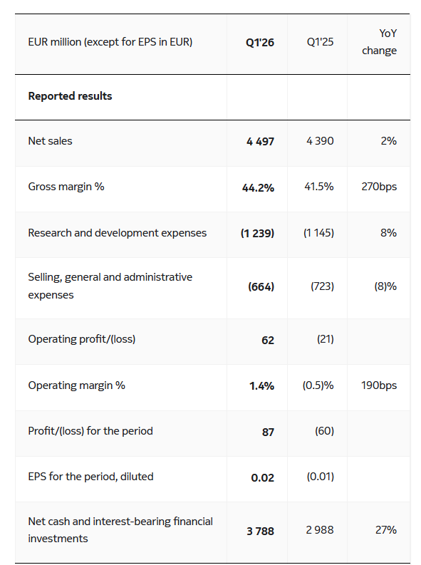 图:诺基亚2026Q1财报部分信息。资料来源:诺基亚。