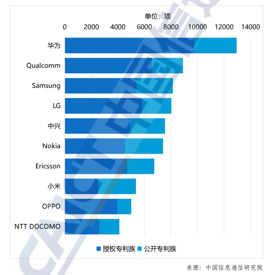 按比例计算,华为的有效专利族数量占比为11.70%,排名第一位;高通排在第二位,其占比为8.05%;三星排在第三位,其占比为7.36%。排名第四位至第十位的企业依次是 LG(7.25%)、中兴 (6.82%)、诺基亚 (6.69%)、爱立信 (6.09%)、小米(4.84%)、OPPO (4.52%)和NTT DOCOMO (3.72%)。