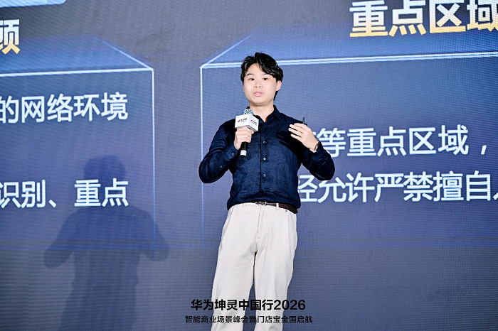峰会现场邀请多行业标杆客户代表,分享门店宝在多元场景中的落地成效与实践价值,优秀方案更将在连锁门店逐步复制推广。四川省福兹特品牌管理有限责任公司总经理杨均介绍,遂宁万达店落地华为坤灵门店宝一体化解决方案,依托AI客流分析精准把控客流时段,手机 APP 远程巡店,让门店管理更高效、更智能;邛崃市分公司智慧广电营业厅项目负责人税钰棋分享,门店宝实现网络安防一体化部署,综合成本降低35%,无感考勤落地高效便捷,收获员工好评;成都猿抱子古树茶社门店经理韩冰洋谈到,门店宝全面赋能茶馆智慧运营、降本增效,切实守护贵重茶品与仓储区域安全。同时依托Wi-Fi 7高速网络,为顾客高清视频会议提供稳定流畅支撑,有效升级消费体验与门店服务品质。