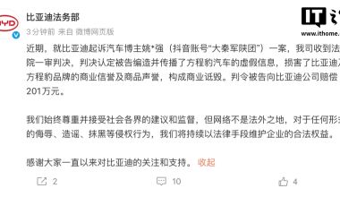 比亚迪法务部:博主“大秦军陕团”编造方程豹汽车虚假信息,被判赔 201 万元