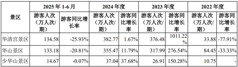 华清宫及华山景区在2023年游客人次明显增加,2024年游客同比增速放缓,2025年1-6月游客同比增长率均下滑20%以上。