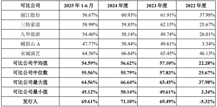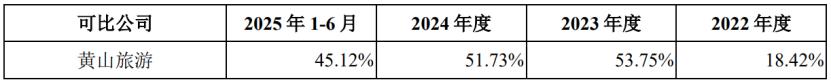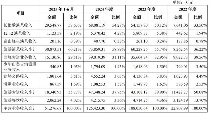 具体来看,2022年、2023年、2024年及2025年1-6月(简称“报告期”),长恨歌演艺收入的营收占比从33.5%提升至57.63%,占比较大;旅游索道的营收占比从50.08%降至35.77%,旅游餐饮的营收占比也有所下滑。