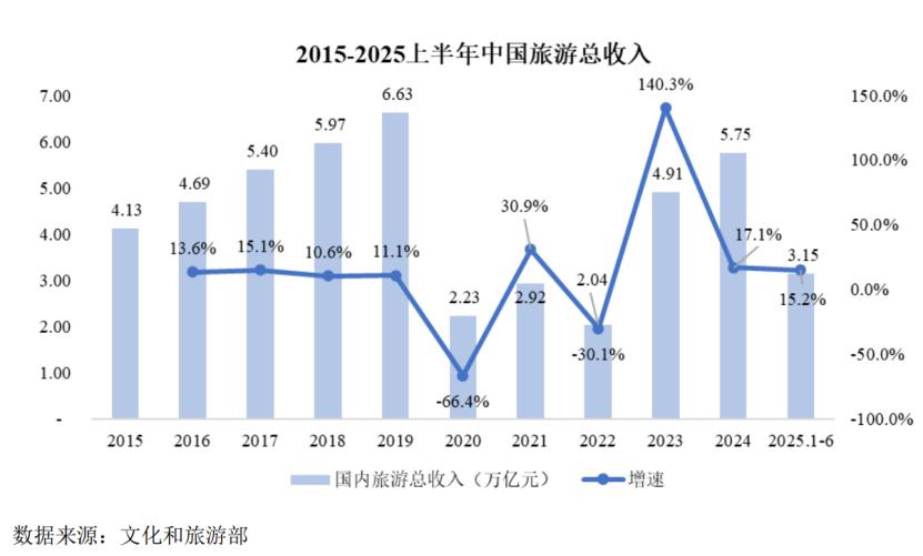 2025年上半年,国内旅游人次为32.85亿人次,同比增长20.6%;国内旅游收入为3.15万亿元,同比增长15.2%。