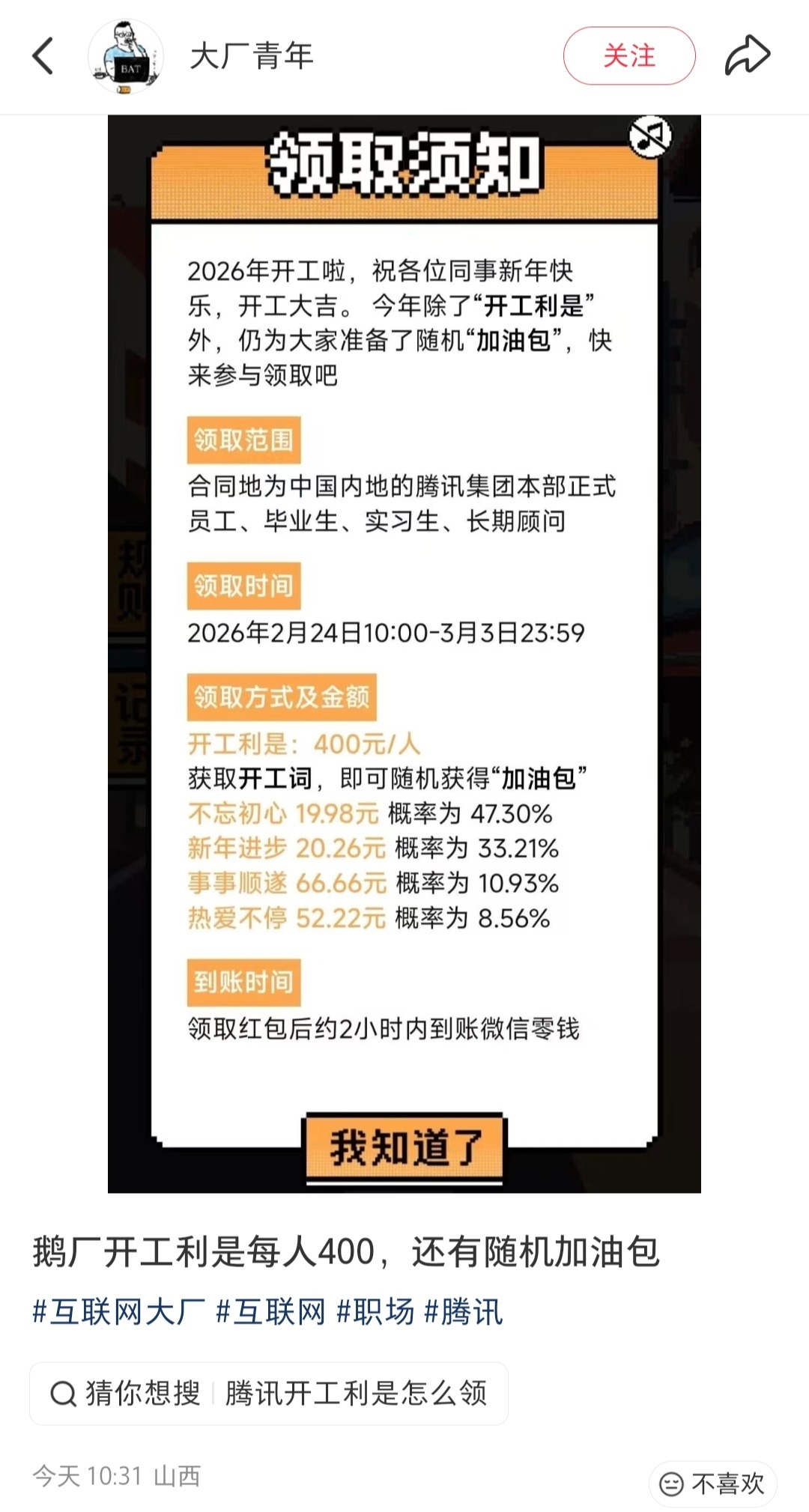 腾讯今日也发布开工红包,每人400 元,还有19.98元~66.66元随机“加油包”。领取范围为合同地为中国内地的腾讯集团本部正式员工、毕业生、实习生和长期顾问。