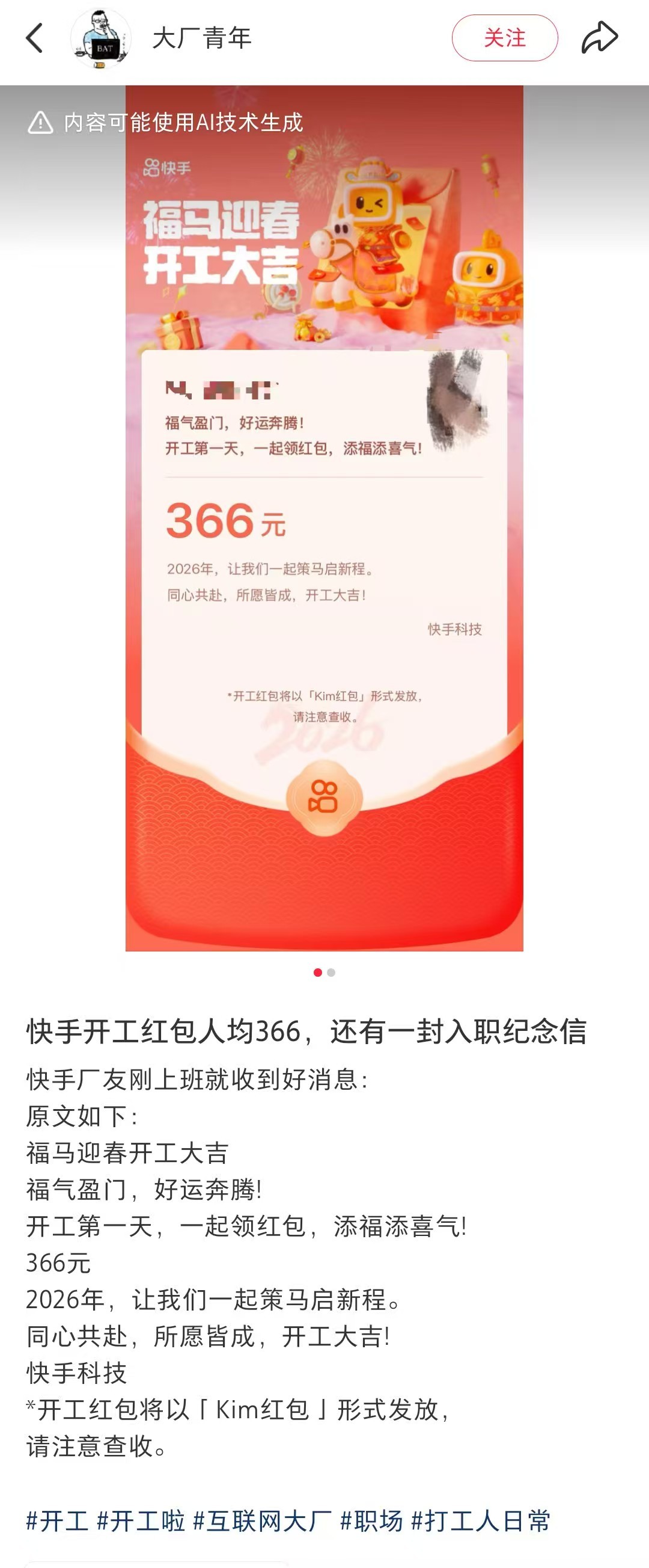 快手给全员发开工红包,正式员工366元,实习生200元。