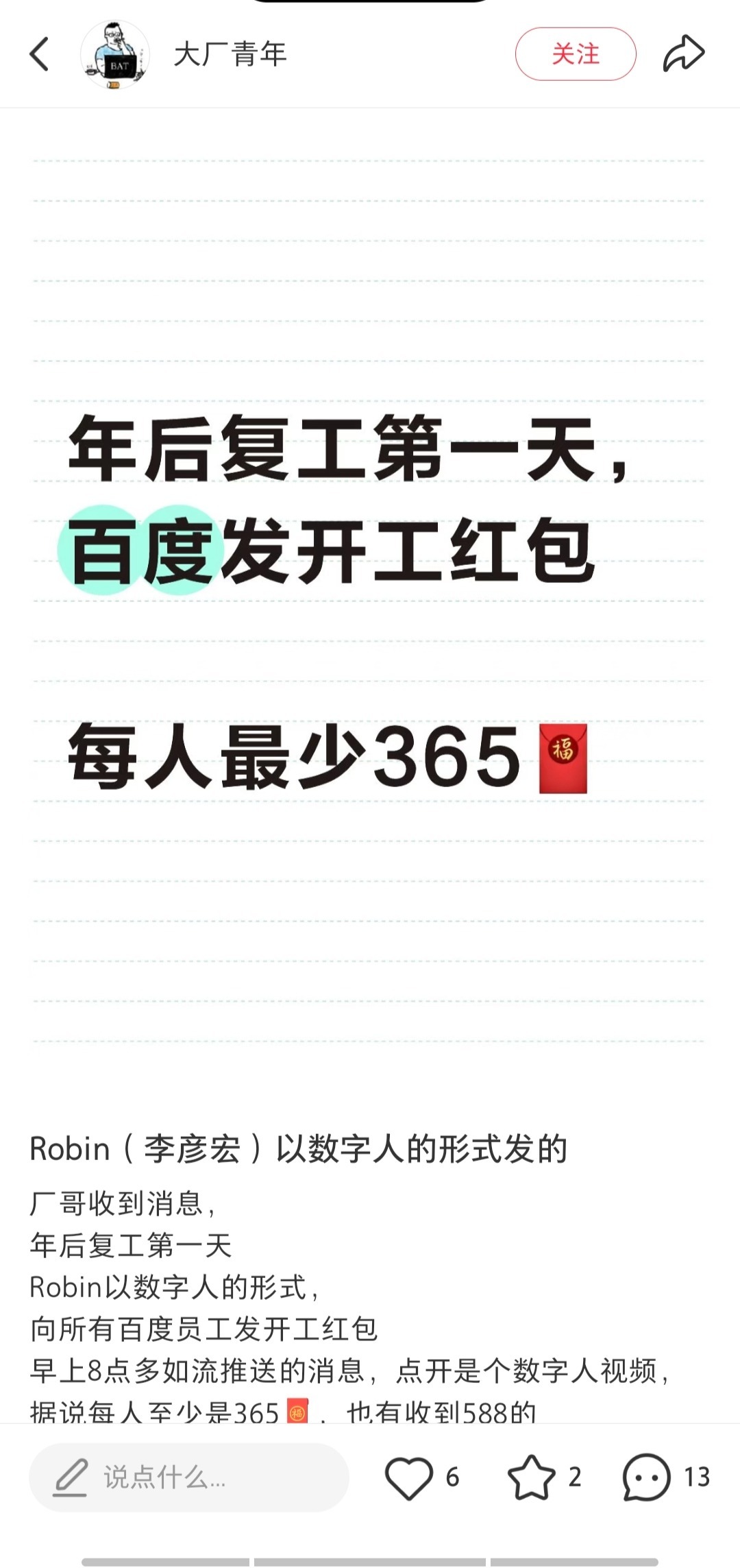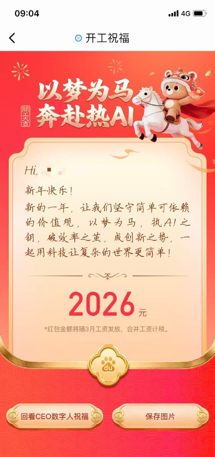 凤凰网科技讯 2月24日,据“大厂青年”爆料,李彦宏以数字人形式向百度员工发开工红包。据说每人至少365元,还有人晒出收到2026元红包的截图。