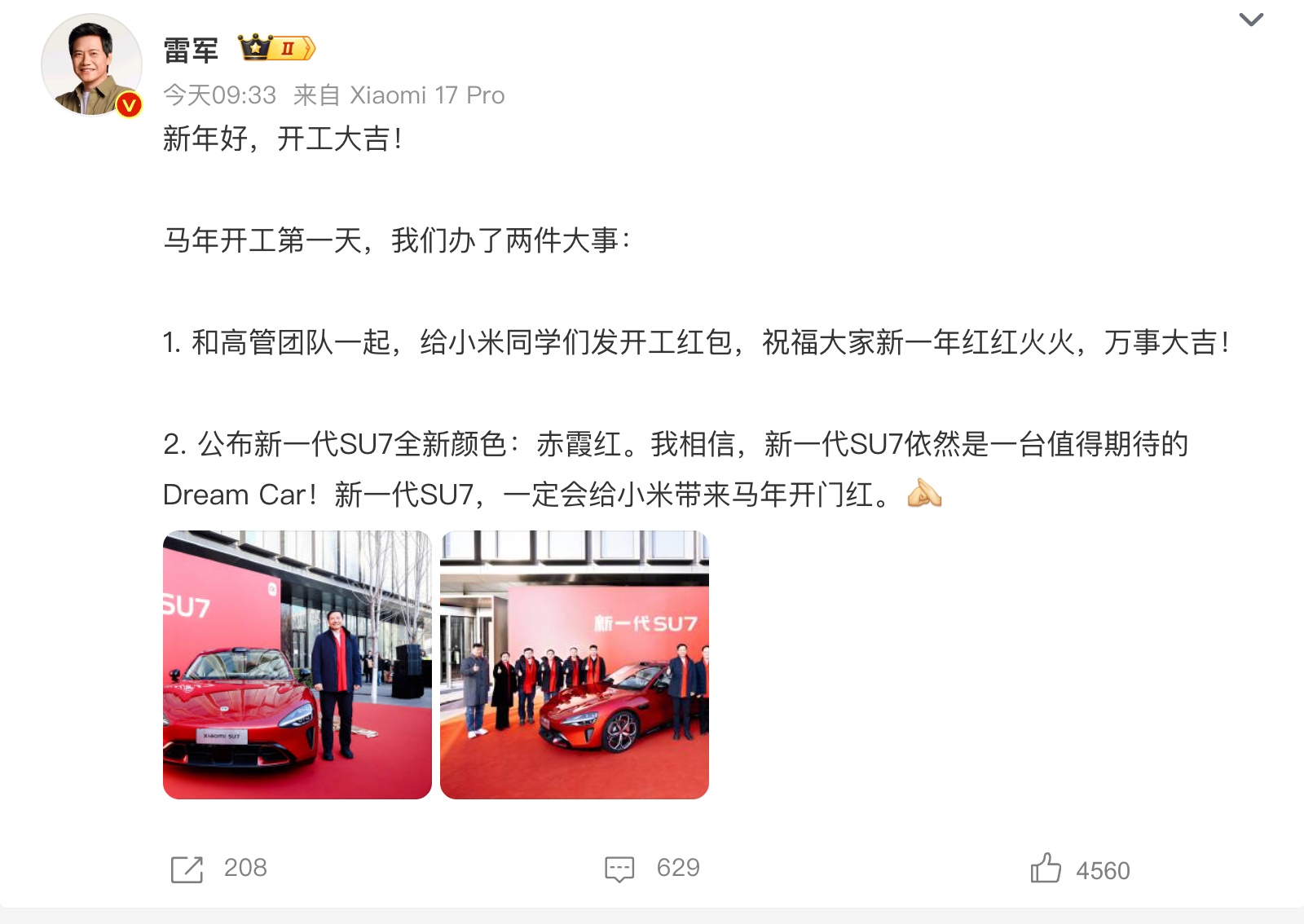 此外,小米创办人,董事长兼CEO雷军今日发文,和高管团队一起,给小米同学们发开工红包。