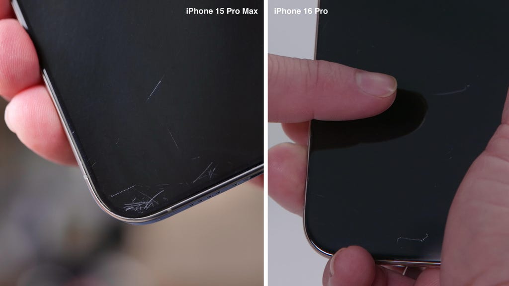 这两张照片均拍摄于使用七个月后。iPhone 15 Pro Max(左)显示屏上划痕明显。iPhone 16 Pro虽有划痕,但保持更佳。Celso Bulgatti/CNET