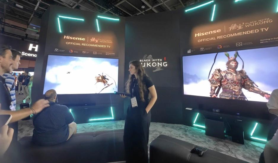 进入由海信和创维共同承包的23号馆,海信展出的《黑神话:悟空》官方定制电视,展示了大型国产3A游戏的高画质,让悟空的衣服褶皱、金箍棒花纹等细节生动显现。