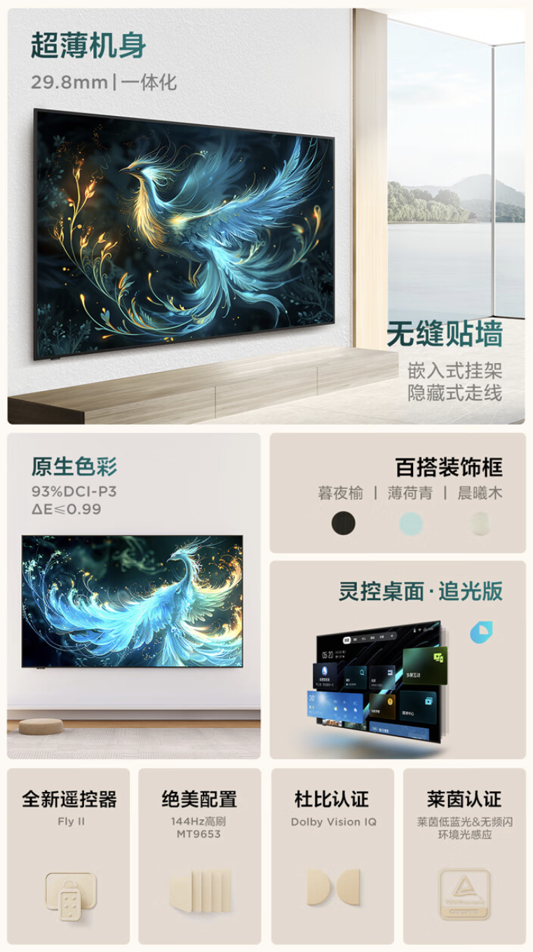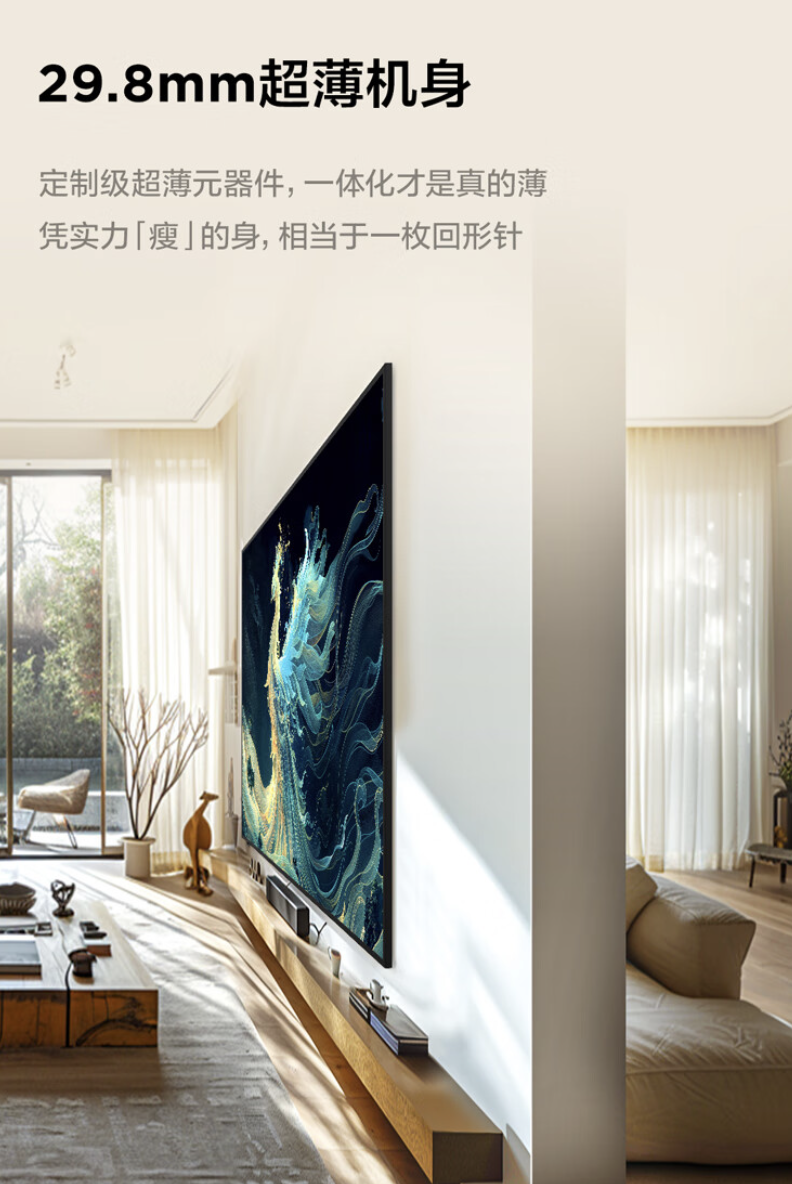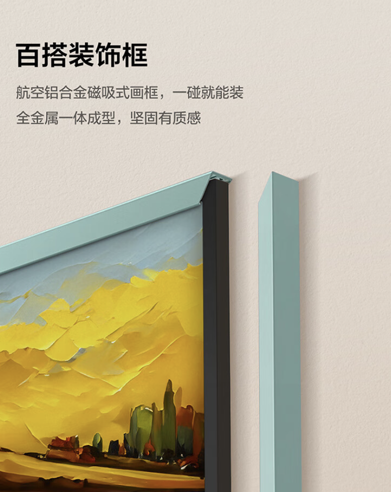 据介绍,这款电视机身厚度 29.8mm,支持“超贴合无缝贴墙”,配有铝合金磁吸式画框,可呈现画框风格效果。