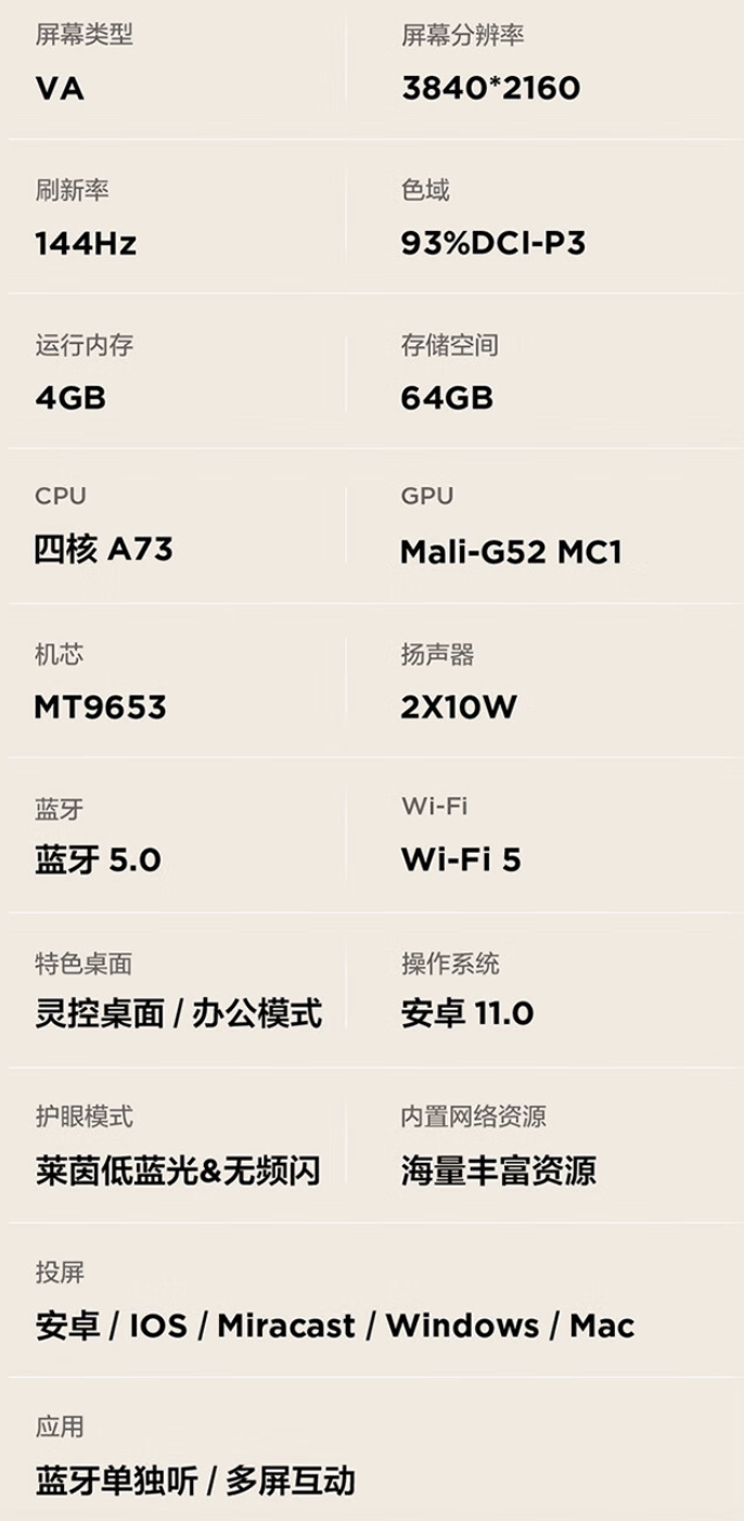 此外,该机搭载四核心联发科 MT9653 芯片,内置 4GB RAM 及 64GB 存储空间,配有 2 个 10W 扬声器,支持 Wi-Fi 5,IT之家整理电视参数信息如下: