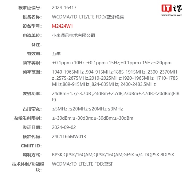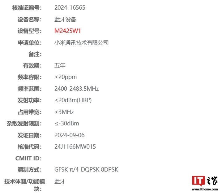 IT之家 9 月 9 日消息,型号为“M2425W1”的小米穿戴类新品通过无线电核准认证。结合此前通过认证的“M2424W1”和“ M2427W1”信息来看,三者有望为同系列产品。