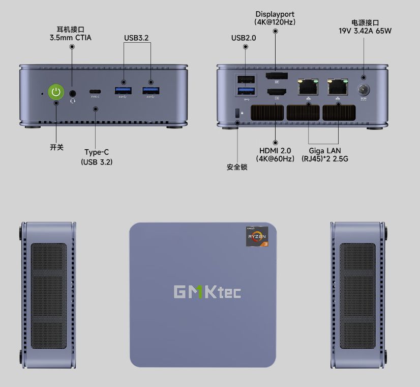 据介绍,极摩客 G6 迷你主机搭载 AMD R3 5425U 处理器,采用 7nm 工艺制程,拥有 4 核 / 8 线程;主机采用环绕式双涡轮散热设计,平衡模式功耗 15W、性能模式 35W、静音模式 10W。