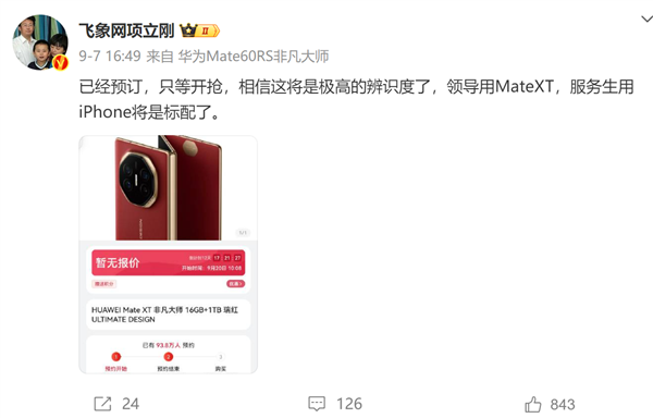 这个预订人群中也包含了飞象网创始人项立刚,其发帖表示,自己已经预订华为Mate XT非凡大师,只等开抢,相信新机将拥有极高的辨识度。