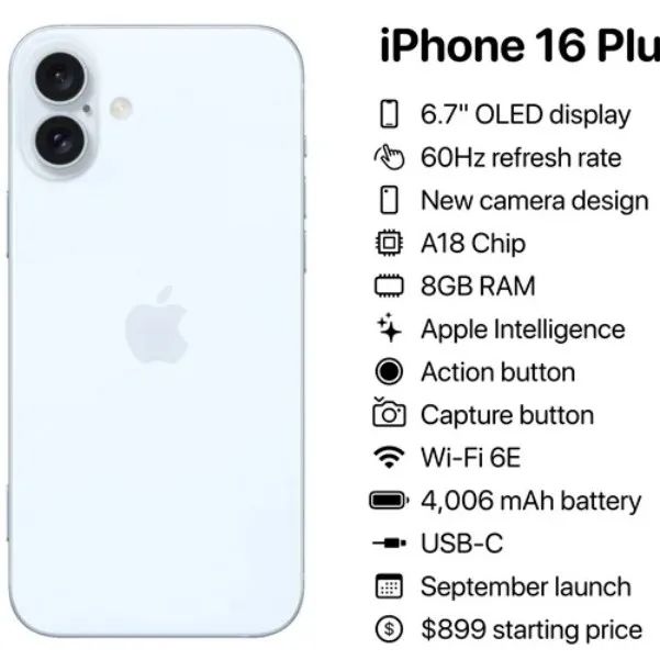 而iPhone 16和16 Plus两款机型将与上一版本外观相似,搭载6.1英寸和6.7英寸的屏幕尺寸,仍旧使用铝制外壳。