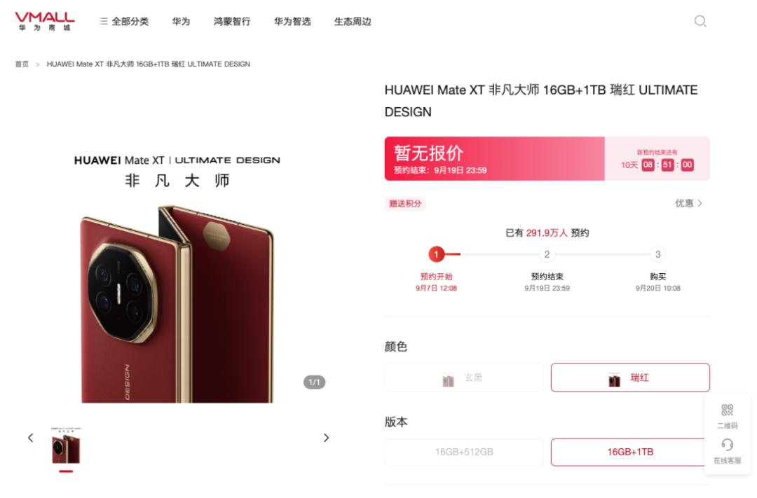 9月7日12:08,华为Mate XT非凡大师开启预订,5个小时后,仅在华为商城预约的人数就超过100万。截至今日3点,华为商城预约人数已经高达 291.9万人