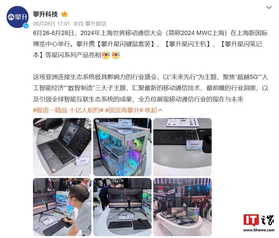 IT之家注意到,攀升科技在今年 6 月的上海世界移动通信大会(2024 MWC 上海)上,展示了系列星闪产品,包括“攀升星闪键鼠套装”、“攀升星闪主机”、“攀升星闪笔记本”等。