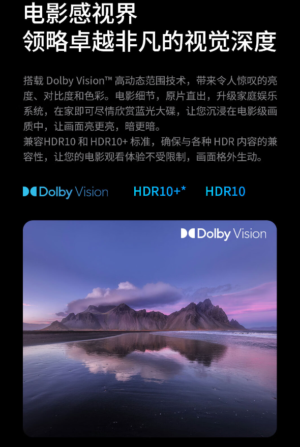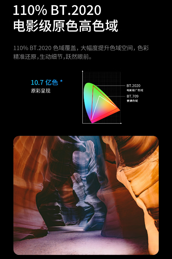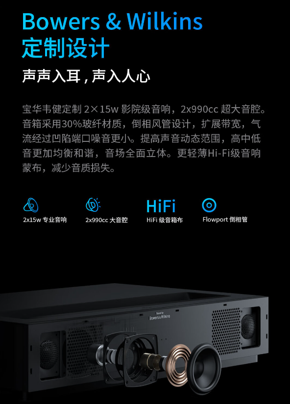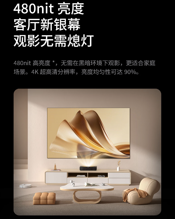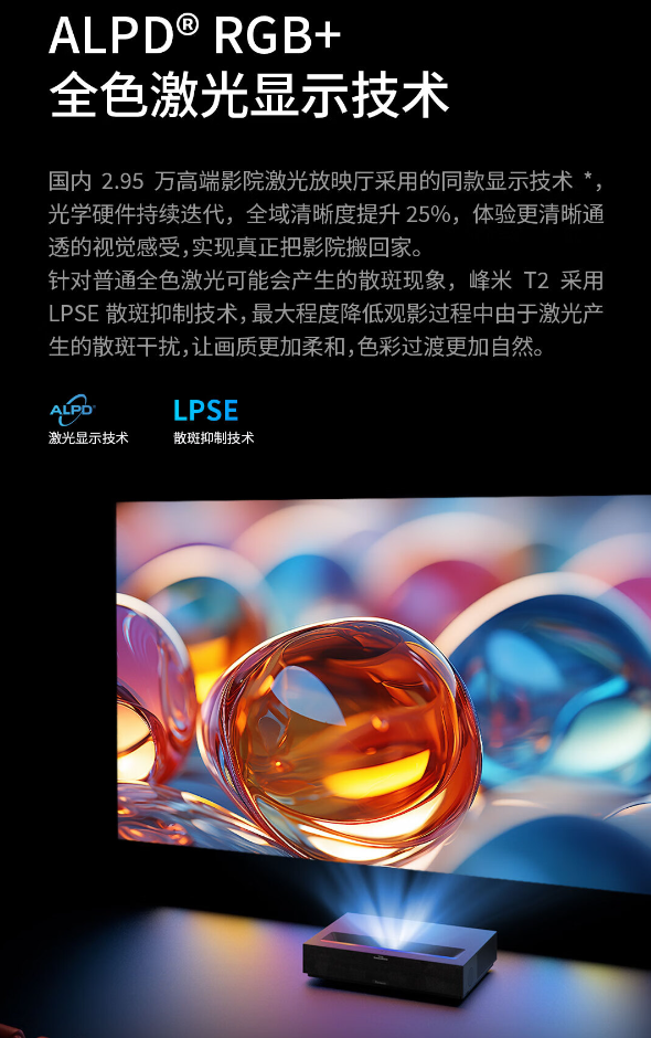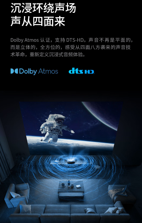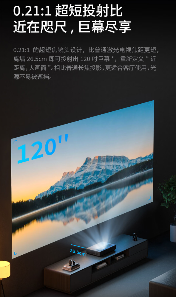 该款激光电视覆盖 110% BT.2020 色域,支持 10.7 亿色显示,采用 0.21:1 超短焦镜头设计,离墙 26.5cm 可投 120 英寸画面。