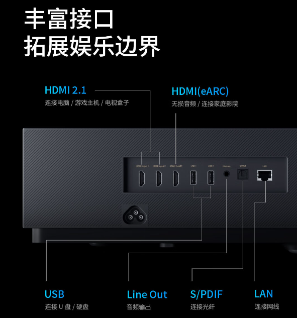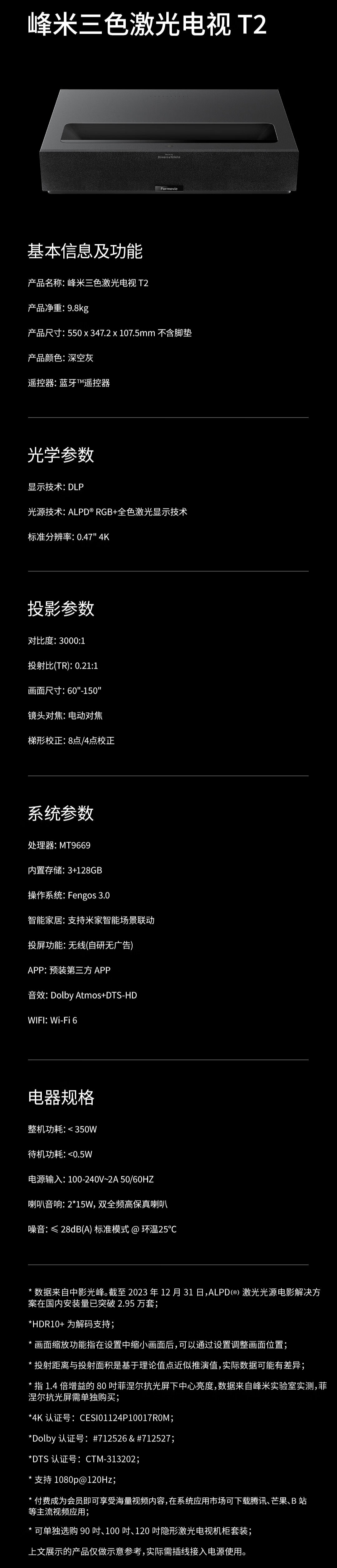 IT之家附峰米三色激光电视 T2 接口及参数信息如下: