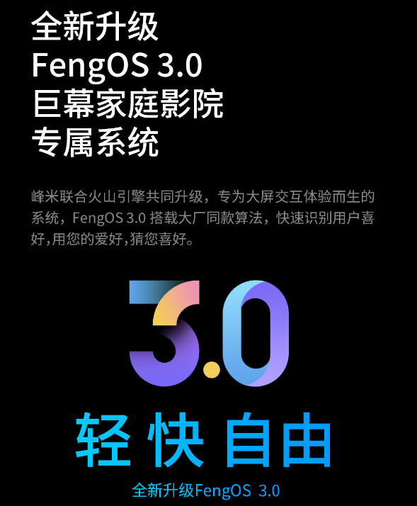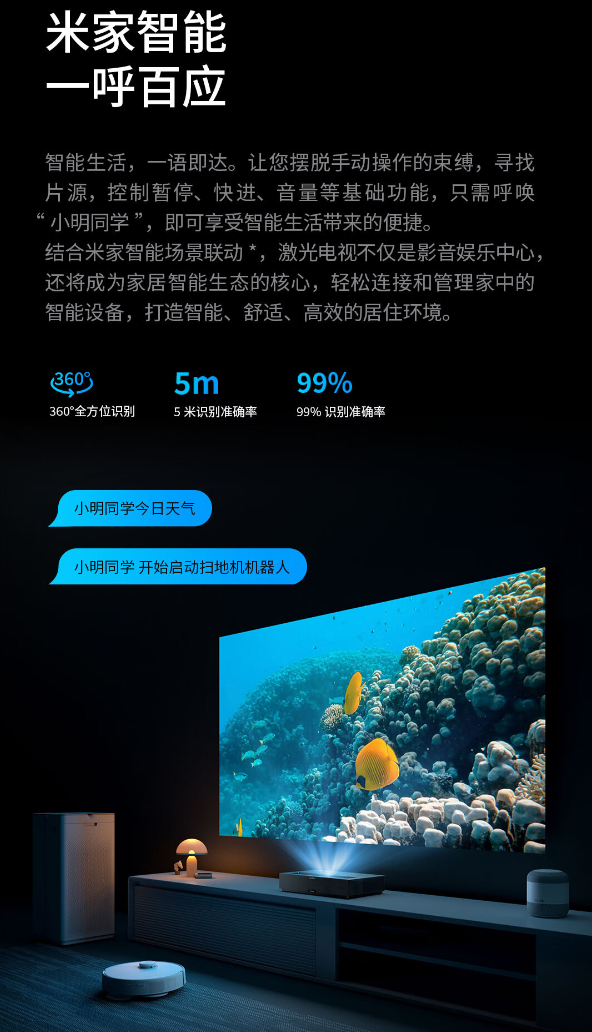 该激光电视预装 FengOS 3.0 系统,支持开机 / 投屏无广告;接入米家智能,可语音唤醒“小明同学”联动米家智能场景,支持 360° 全方位识别,拥有 99% 识别准确率。