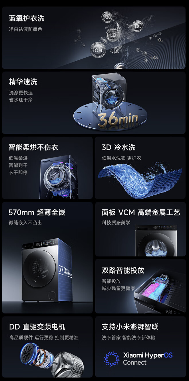 此外,该机支持 36 分钟速洗,拥有“低温柔烘”技术,实现 55-65 度精控温度,拥有 14.5m/s 风速,可实现“衣干即停”。