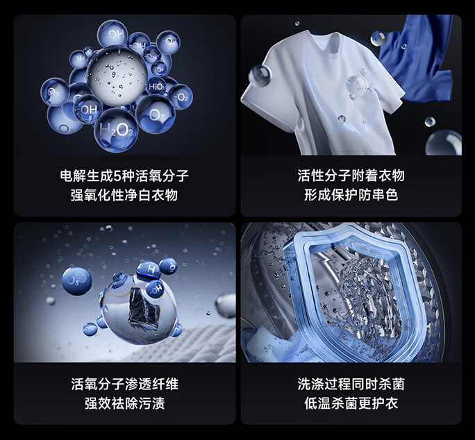 据介绍,这款洗衣机拥有“蓝氧护衣净化洗”特性,号称通过电解水分子产生“蓝氧净化分子”,利用器强氧化性瓦解深色衣物掉落的游离染料 / 色素类污渍,从而减少衣物串色情况。