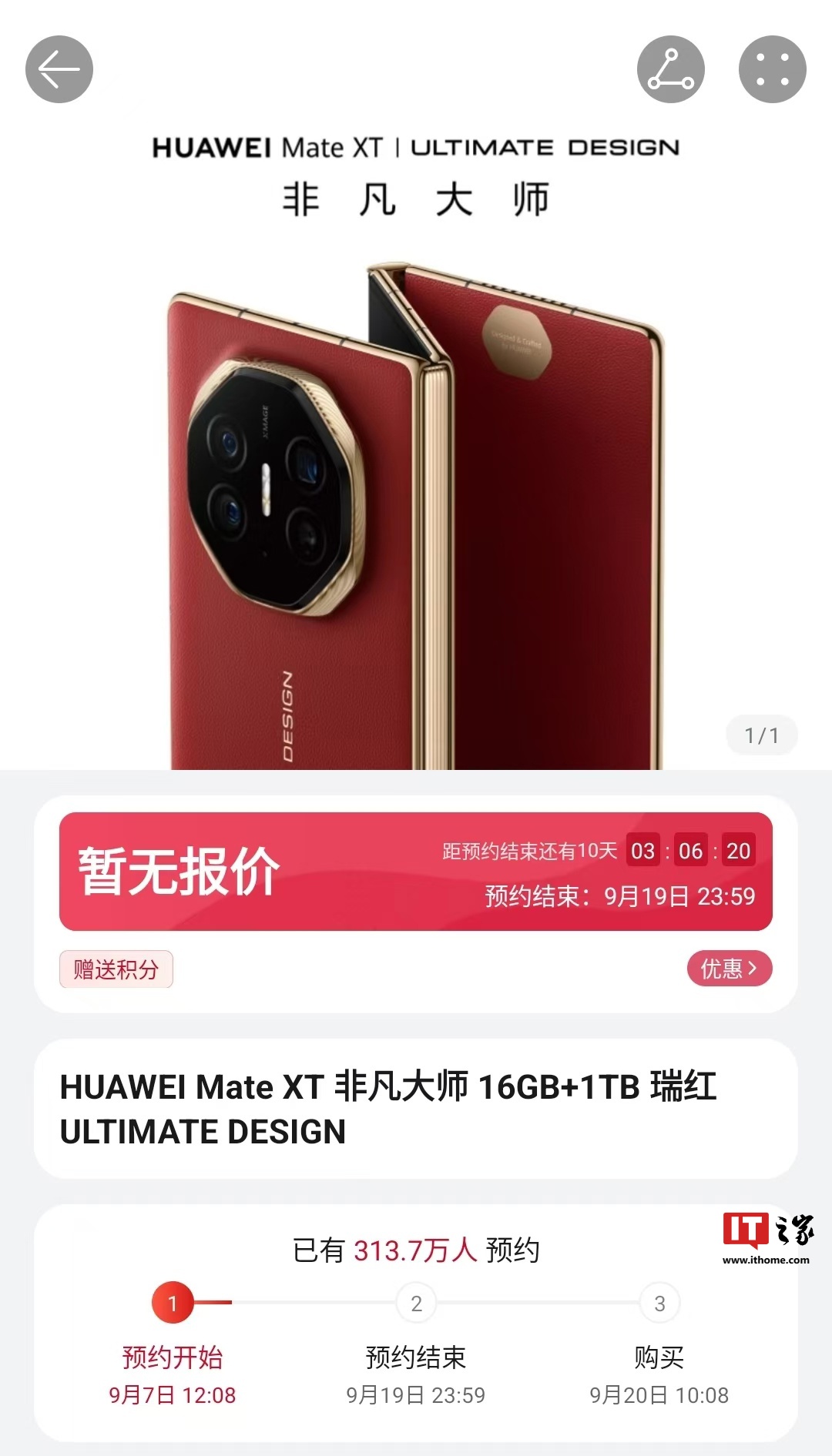 IT之家 9 月 9 日消息,宣布开启预订两天之后,华为 Mate XT 非凡大师三折叠手机的预约量已经突破 300 万大关。截至IT之家发稿,该机已在华为商城取得 313.7 万人的预约量。
