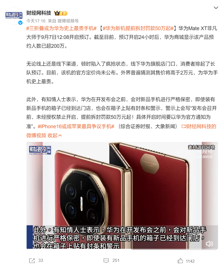 《华为 Mate XT 非凡大师三折叠手机预约量突破 200 万,二手平台开启“加价收货”》