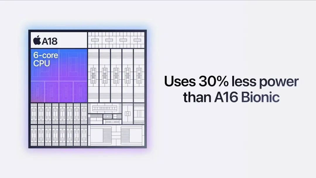 并且,A18 拥有 6 核 CPU,包含 2 个性能核心和 4 个效率核心,比 iPhone 15 中的 CPU 快 30%,而在同等性能下,功耗可以减少 30%。